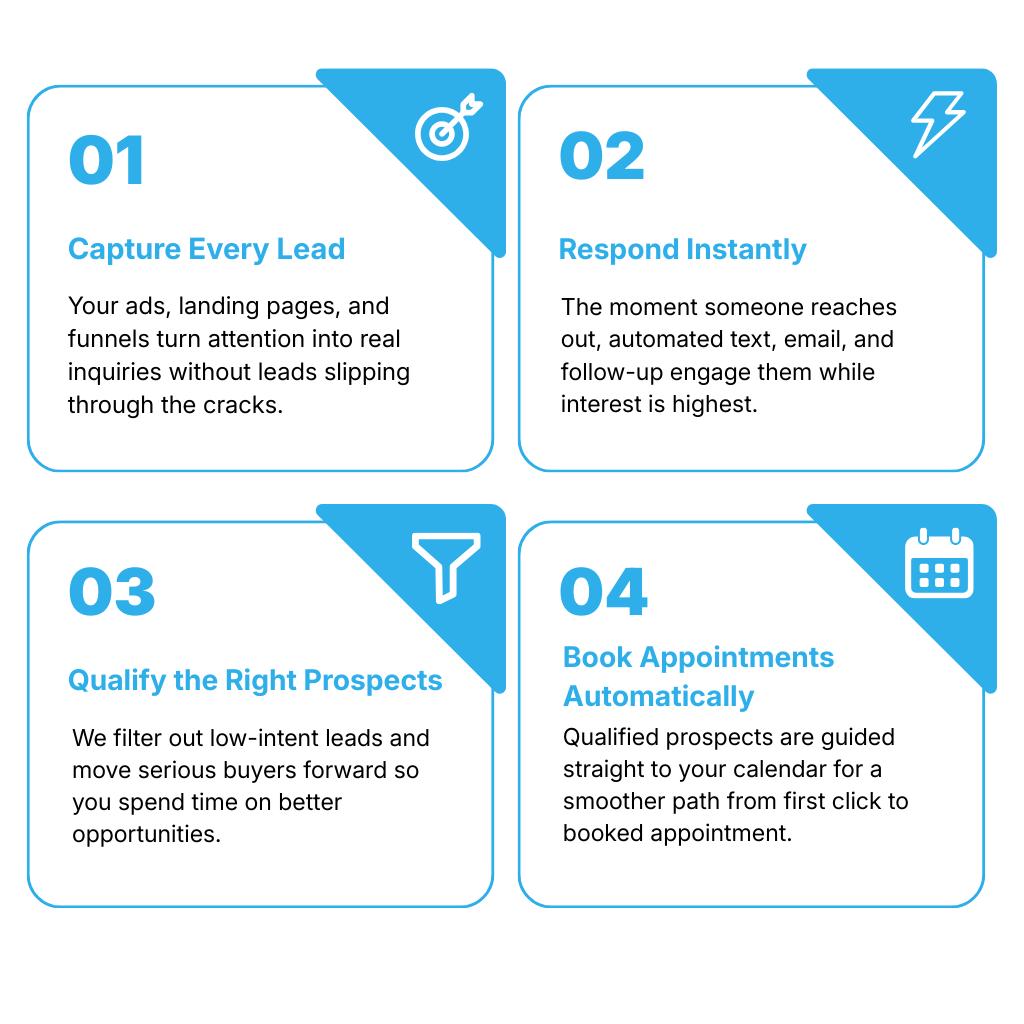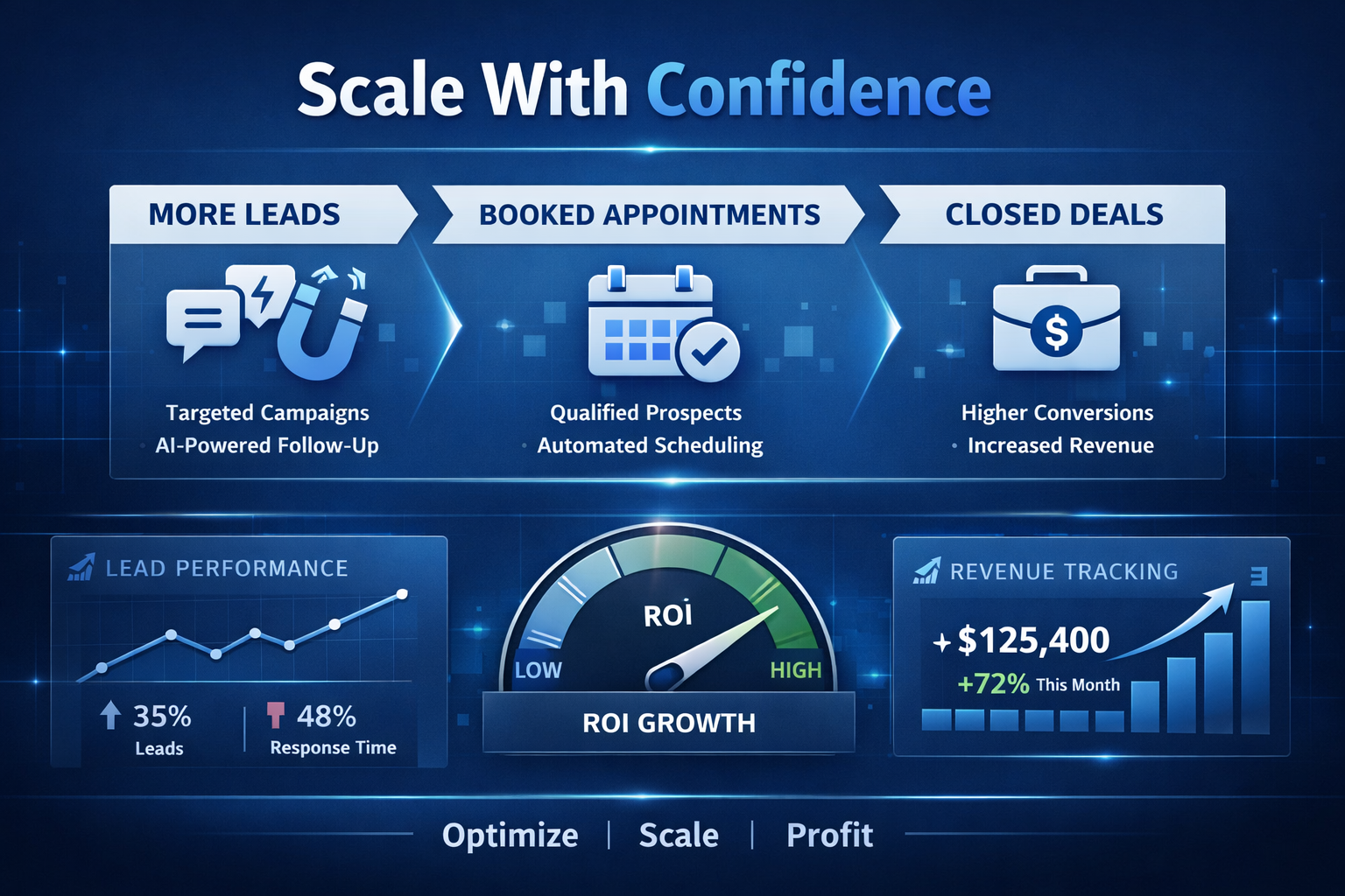 We activate campaigns, refine messaging, and continuously improve how leads are handled, qualified, and booked.